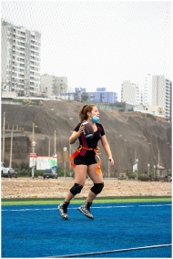 A woman in sportswear plays flag football on an ou