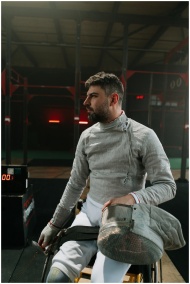 Male athlete in wheelchair fencing gear, indoors, ready for a match.
