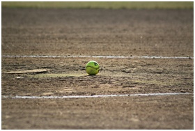 A lone softball sits on a dusty field, capturing the essence of the sport.