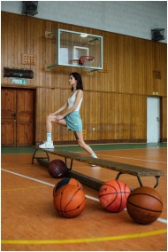 Young woman in gym attire stretching on a wooden bench in a gymnasium.
