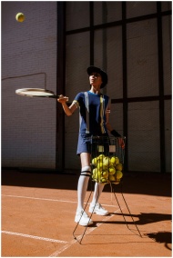 Female tennis player practicing on a clay court with tennis hopper.