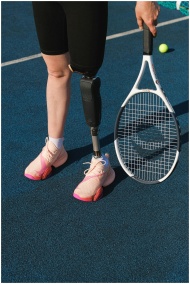 Athlete with prosthetic leg standing on tennis cou