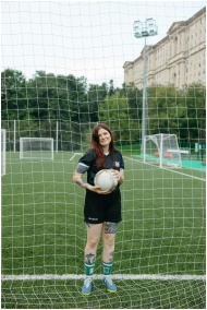 A woman soccer player standing with a ball on a green field, netting in the foreground.