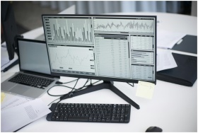 A professional workspace featuring computers and analytical graphs on a monitor, symbolizing modern business environment.