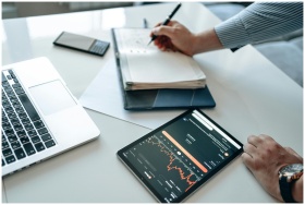 Close-up of a business professional analyzing data trends using a tablet and laptop.