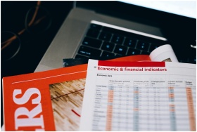 Detailed close-up of economic and financial documents on a laptop keyboard, highlighting data analytics.