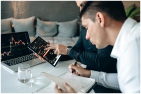 Two businessmen in a meeting analyzing financial data with digital devices and taking notes.