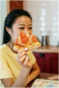 A young woman smiles while holding a piece of pepperoni pizza in her cozy home kitchen.