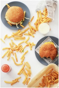 Flat lay of cheeseburgers and crinkle-cut fries on