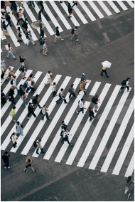 Top view of people crossing at famous Shibuya Intersection in Tokyo, Japan.