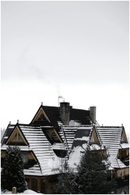 A cozy wooden house in winter surrounded by snow in Bukowina Tatrzańska, Poland.