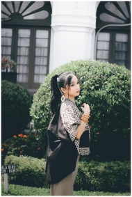 Stylish woman posing in a lush garden in Bandung, Indonesia, showcasing contemporary fashion.