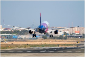 A vibrant airplane lands on the runway at Manises Airport, Valencia, Spain.