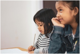 Two young girls joyfully engaged in creative learning indoors, capturing a candid moment of togetherness.