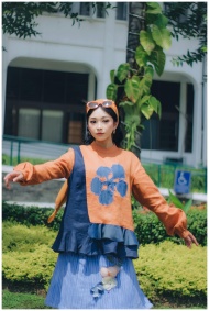 Stylish woman posing outdoors in a colorful outfit, Bandung, Indonesia.