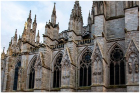 Detailed view of the Gothic architecture of Bordeaux Cathedral in France.