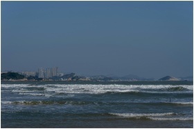 Beautiful seaside landscape with city skyline and waves under a clear sky.