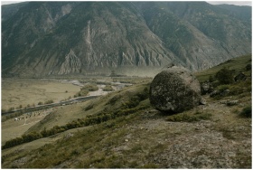 Captivating view of a vast mountainous landscape featuring a prominent boulder in the foreground.