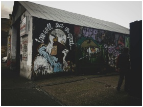 Graffiti on a building wall depicting street art and urban culture.