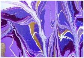 Abstract fluid art painting featuring vivid purple and gold colors with a marbled texture.