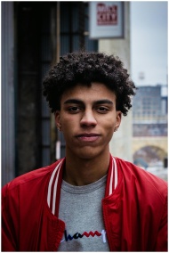 Portrait of a young man in a red jacket, captured in an urban setting with a solemn expression.