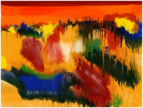 A vivid abstract painting with bold colors and dynamic dripping patterns.