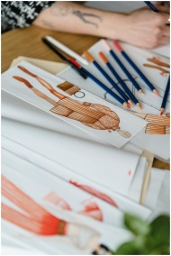 Close-up of fashion design sketches with pencils o