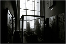 Elegant black and white image showcasing museum interior with sculptures and intricate wall art in soft light.