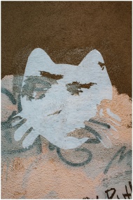 Artistic cat graffiti painted on a rough urban wall, showcasing abstract street art style.