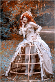A woman in elaborate fantasy costume poses in an a