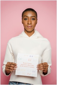 Confident African American woman holding sign to raise breast cancer awareness against pink backdrop.