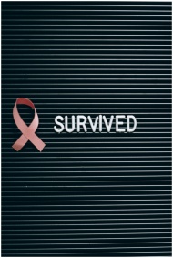 Pink ribbon and 'SURVIVED' note symbolizing breast