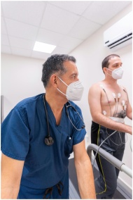A doctor monitors a patient's cardiac stress test in a clinical setting, ensuring patient safety.