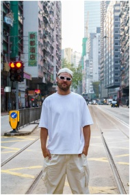 Man in casual attire stands on a city street in Hong Kong, surrounded by urban architecture.