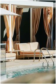 Sunny poolside cabana with striped curtains and loungers next to a swimming pool.