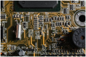Detailed close-up of a circuit board showing various electronic components and traces.