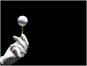 Close-up of a golf ball on a tee held by a gloved hand on a black background.