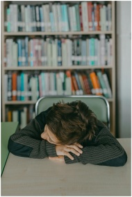 A young boy rests asleep with his head on a desk in a library, surrounded by bookshelves.