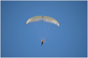 A thrilling shot of a paraglider soaring high against a clear blue sky in England.
