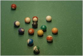 A top view of scattered colorful billiard balls on