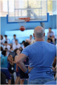 A basketball coach watches an indoor game, focusing on players in action.