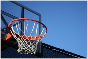 A vibrant outdoor basketball hoop with net set against a clear blue sky, ideal for sports visuals.
