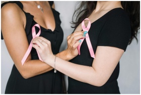 Close-up of two women holding pink ribbons symbolizing breast cancer awareness and support.