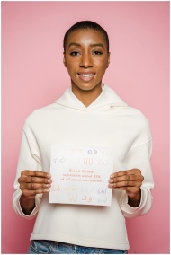 A young woman holds a sign for breast cancer aware