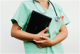 Close-up of a nurse in green scrubs holding a tablet and stethoscope, symbolizing modern healthcare.