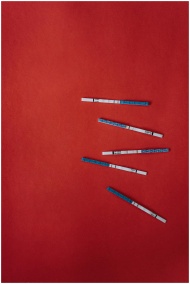 Pregnancy test strips arranged on a vivid red back