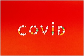 COVID spelled using assorted pills on a vibrant re