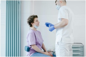 Healthcare worker performs a COVID-19 swab test on a seated patient indoors.