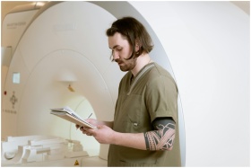 Radiology technician taking notes beside an MRI machine in a modern medical facility.
