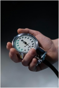 A hand holding a sphygmomanometer showing blood pr